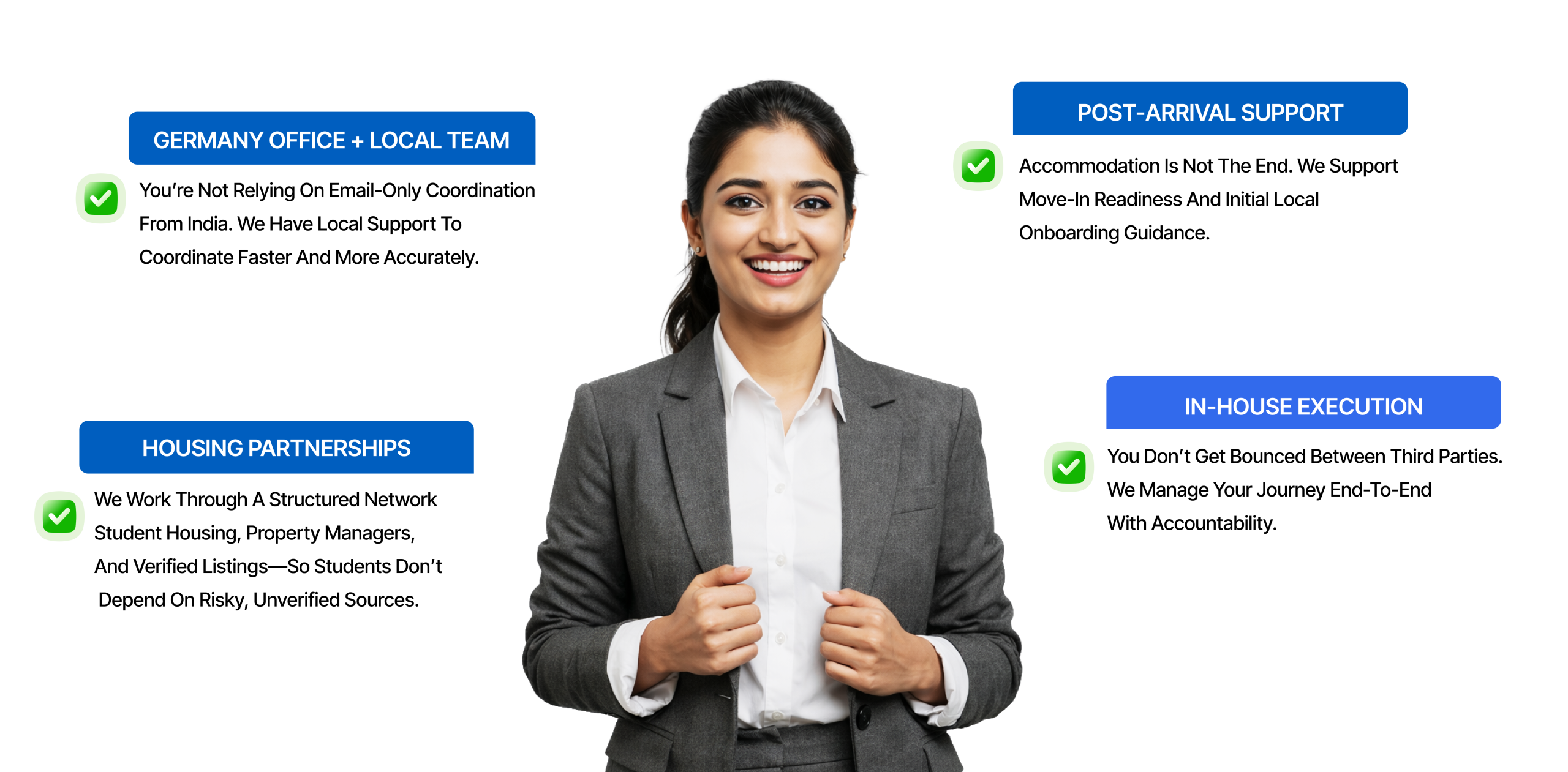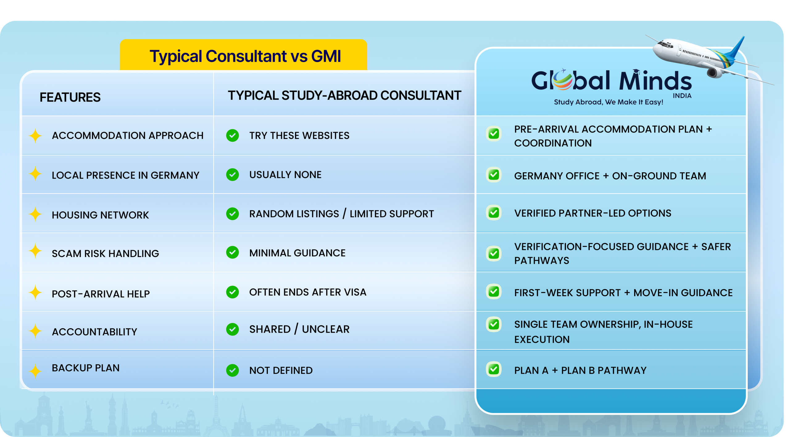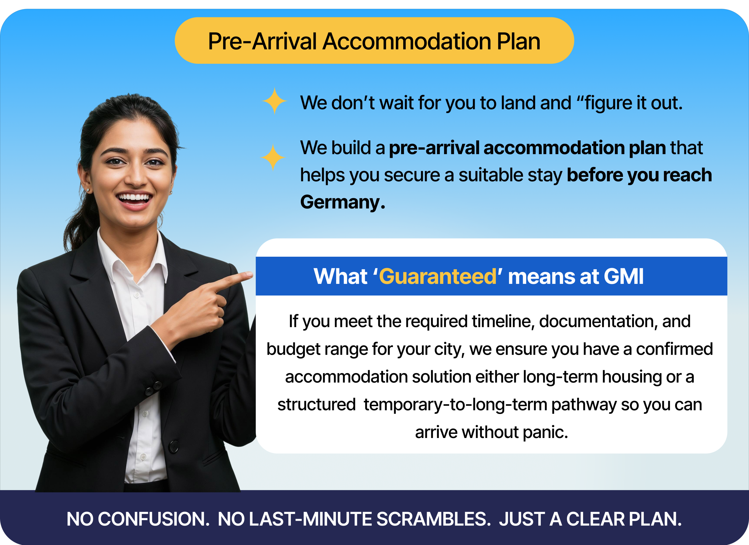 Guaranteed” means GMI will provide a confirmed accommodation solution subject to city availability, intake season, budget alignment, documentation readiness, and minimum processing timelines. Housing confirmation ultimately follows provider policies and contract terms. GMI supports planning, verification guidance, coordination, and post-arrival assistance as per the chosen service plan.